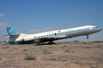 Sitting rather sadly on its tail just outside the maintenance area was one of the highlights of the trip - Syrian Air Caravelle YK-AFB with Syrian Air Tupolev 154 YK-AIC on the maintenance ramp as well as a view of the rest of the ramp.
